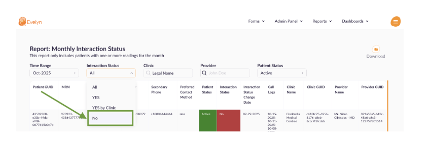 Set Interaction Status = No to view only patients who need interactions logged.